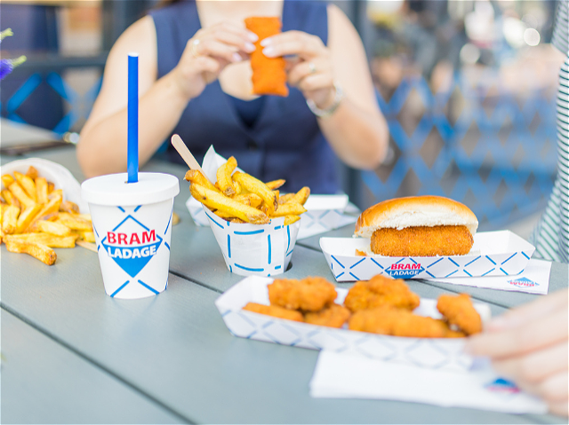 Heerlijke krokante kipburger (naar keuze classic/spicy/pinda) op een broodje met sla en daarbij een lekkere verse Bram en een drankje naar keuze.